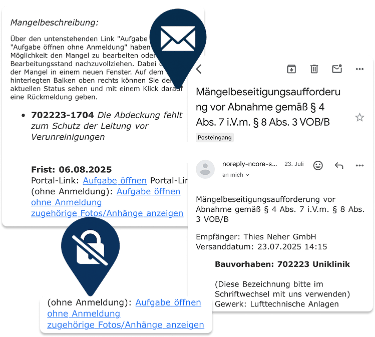 Ja, externe Partner wie Nachunternehmer oder Fachplaner können Aufgaben ganz unkompliziert bearbeiten – auch ohne Login oder Benutzerkonto. Sie erhalten einen E-Mail-Link mit direktem Zugriff auf ihre Aufgabe, inklusive Kommentarfunktion und Möglichkeit zur Statusaktualisierung. So wird die Zusammenarbeit vereinfacht und Rückfragen werden deutlich reduziert.