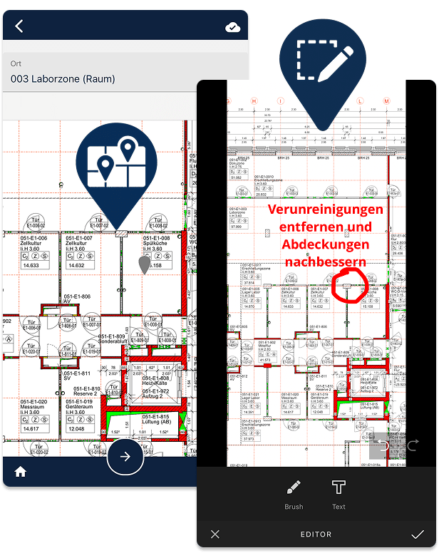 Dokumentiere Mängel, Zustände oder Fortschritte direkt auf der Baustelle – per Foto, Spracheingabe oder Text. Die App funktioniert auch offline und erkennt automatisch den Standort auf dem Plan.